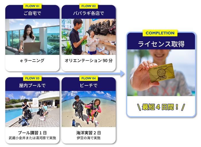 このコースは、「学科」、「プール講習」、「海洋実習」の3つのステップから成り、4日間での受講が一般的です。